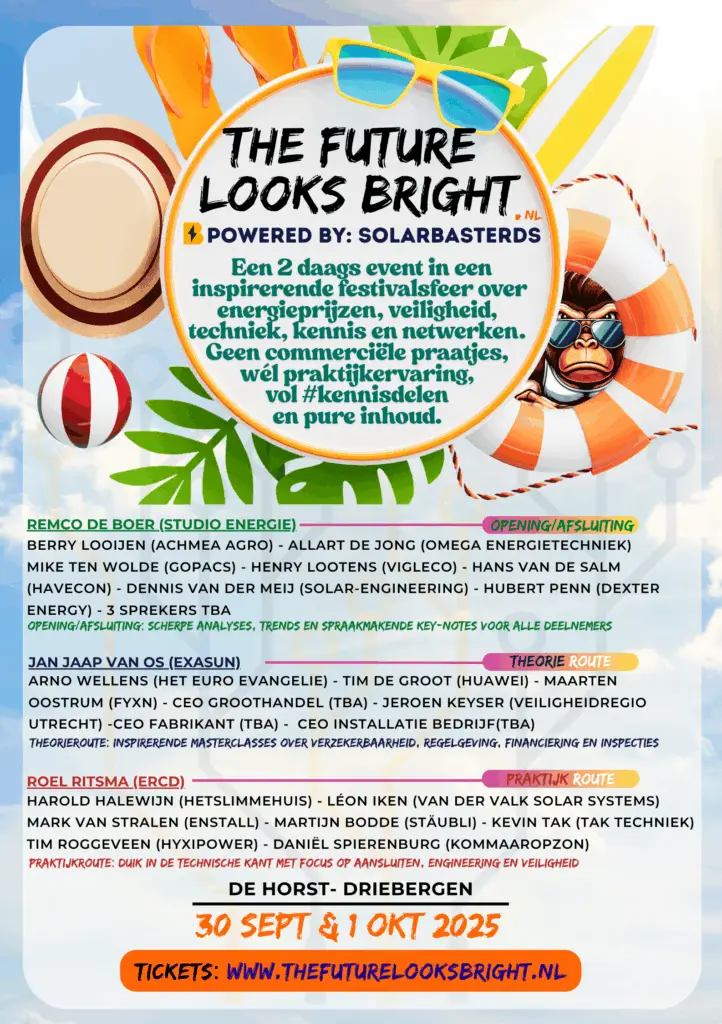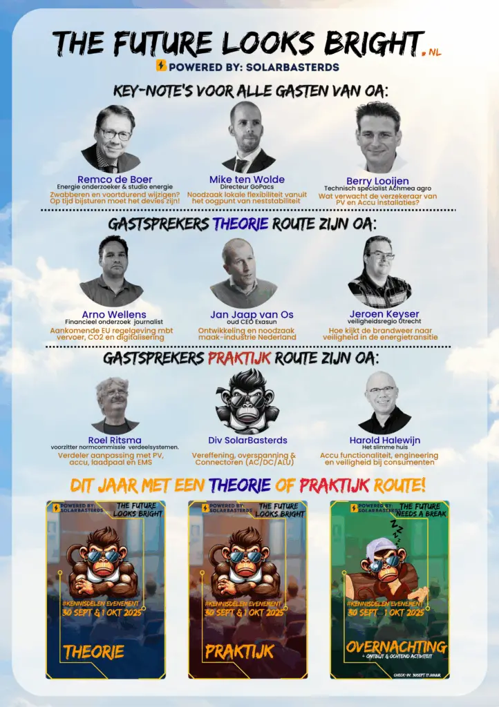 De meeste events over verduurzaming zitten vol verkooppraat, gesponsorde keycords en gladde verhalen. Bij The Future Looks Bright powered by Solarbasterds doen we daar niet aan mee. Geen verborgen agenda’s, geen deals met fabrikanten, geen praatjes voor de bühne. Onze sprekers worden betaald om hun kennis te delen en niet om je via hun datasheet jou iets te verkopen. Wat je krijgt, is eerlijke, rauwe informatie van mensen die de energietransitie dagelijks van dichtbij meemaken. Zonder filter. Zonder marketing. Maar in een uniek concept waarbij Samenwerken en kennisdelen centraal staat.