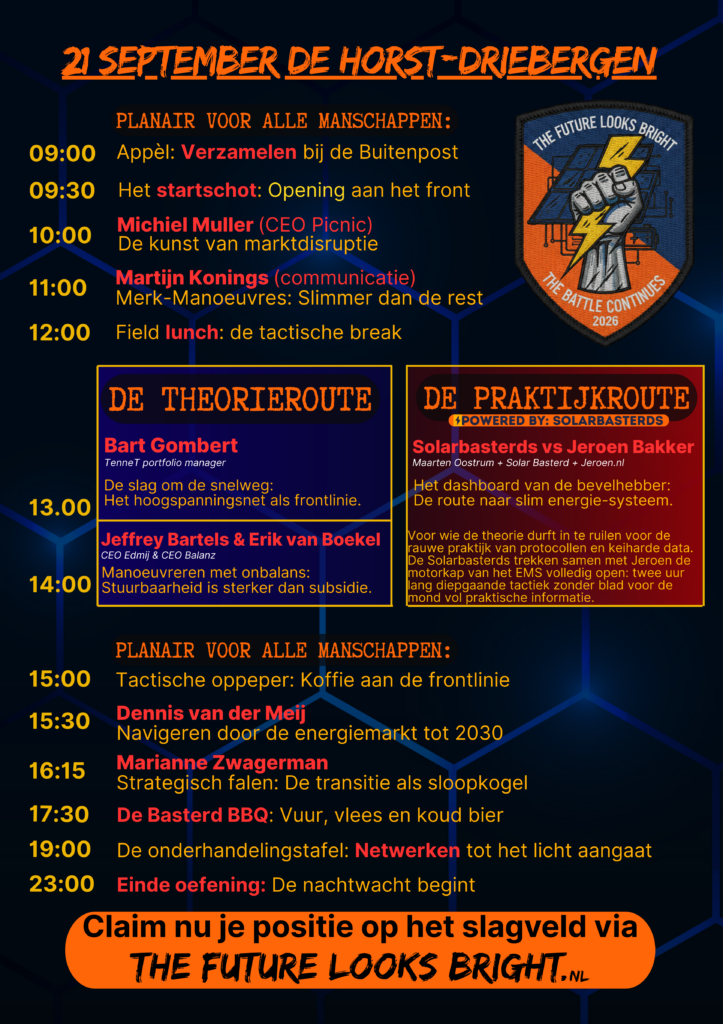 Hoe smeed je een onverwoestbare energie-installatie in de praktijk? De Solarbasterds nemen je mee naar de werkplaats waar de accu en het EMS centraal staan. Ontdek de fijne kneepjes van de technische configuratie. Een sessie voor vakmensen die munitie willen maken van moderne technologie aan het front.